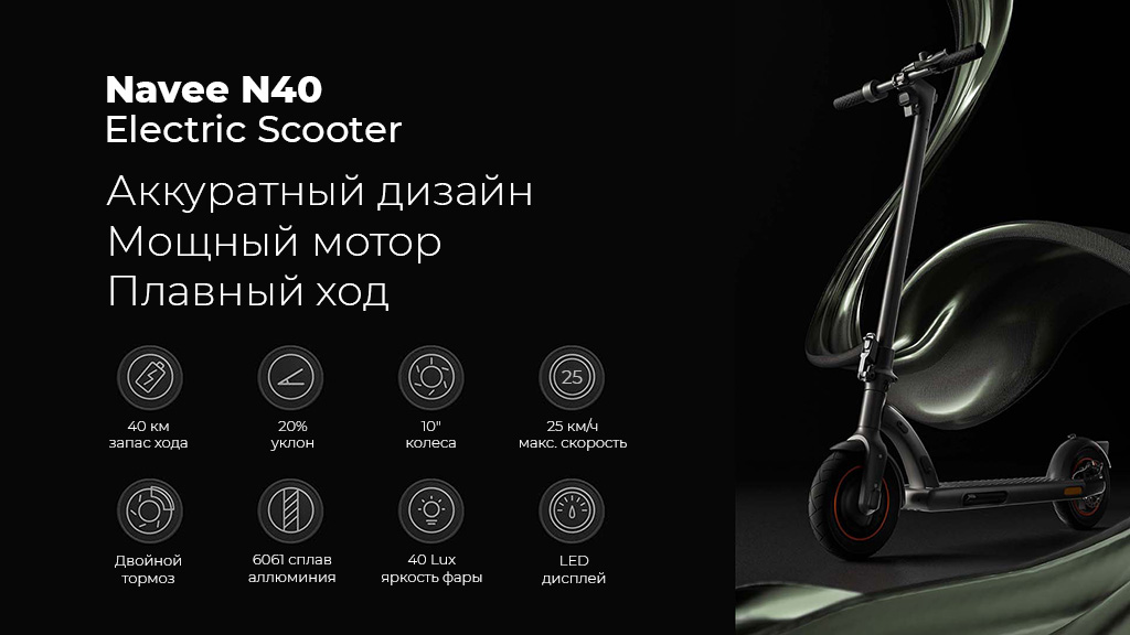 Электросамокат Navee N40 с большим запасом хода и скоростью 30км/ч - отличный выбор для городских прогулок. Облегченный корпус из алюминиевого сплава марки 6061 уменьшил вес самоката до 15 кг, а надежная конструкции выдерживает нагрузку до 100 кг.